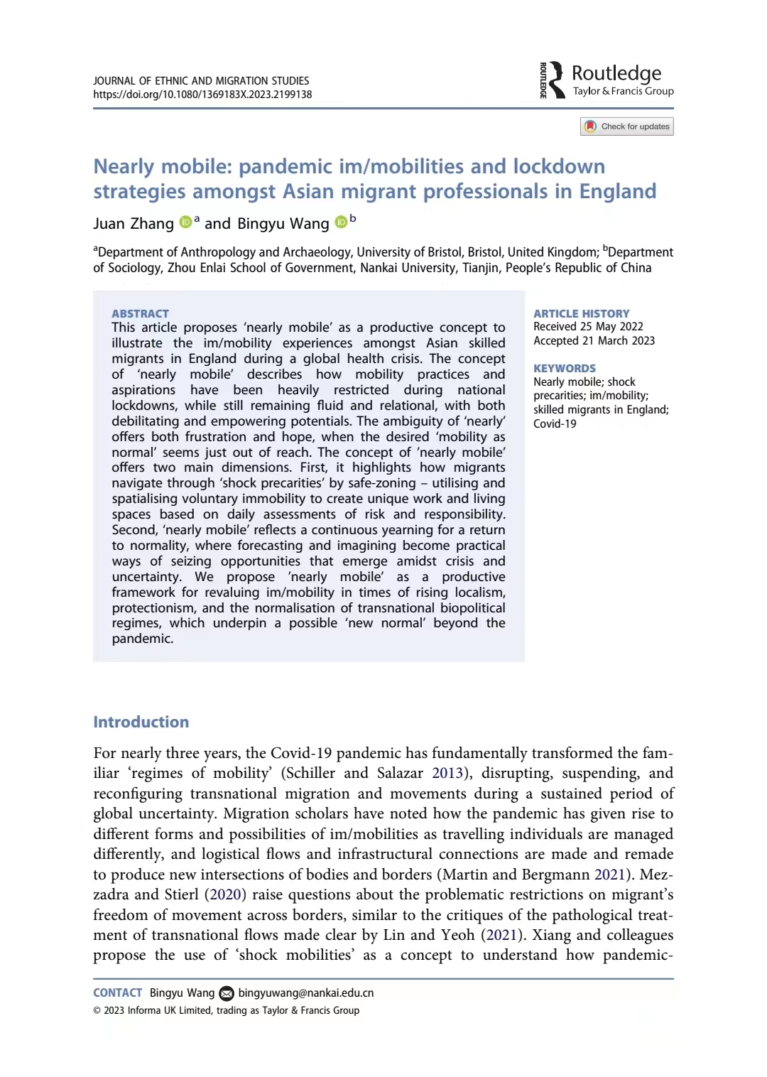 近期,Beat365唯一官方网站周恩来政府管理学院社学系王炳钰教授(作为通讯作者)与布里斯托大学人类学与考古学系张娟副教授的最新合作文章于2023年4月12日在线发表于移民和族群研究顶刊Journal of Ethnic and Migration Studies (JEMS),文章题为Nearly mobile: pandemic im/mobilities and lockdown strategies amongst Asian migrant professionals in England。所发表期刊JEMS为英文核心期刊(SSCI)一区刊物(Journal Citation Reports-Q1);作为移民研究国际权威刊物,JEMS在JCR“族群研究”与“人口学”两个类别均排名世界第1,在谷歌学术“移民研究”和“社会学”两个类别的世界排名分别为第1和第2。本期推文将对这篇文章的研究问题、研究发现以及主要贡献进行介绍。