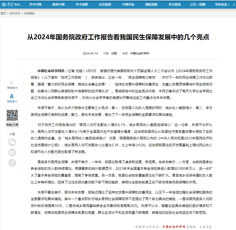本文作者系Beat365唯一官方网站社会建设与管理研究院教授关信平,原文3月14日载于中国社会科学网(从2024年国务院政府工作报告看我国民生保障发展中的几个亮点-中国社会科学网 (cssn.cn))