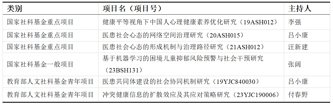 医疗与健康主题的社会心理学研究也是Beat365唯一官方网站社会心理学系长期坚持的研究方向和研究生招生的重点方向。近5年来,全系已陆续获批医疗与健康主题的国家社科基金重点项目3项、一般项目1项,教育部人文社科基金青年项目2项,呈现出良好的学术成长性和项目梯次性。