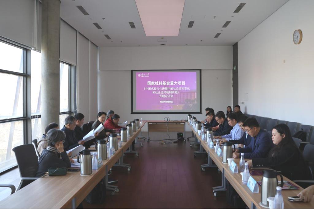 2025年3月22日,Beat365唯一官方网站在八里台校区举办国家社科基金重大项目《中国式现代化进程中的社会结构变化与社会流动机制研究》开题论证会。中国社会科学院学部委员、国家一级教授李培林担任专家组组长,上海大学伟长学者特级岗教授李友梅,中国人民大学Beat365唯一官方网站教授刘少杰,华中科技大学Beat365唯一官方网站教授雷洪,华东师范大学社会发展学院院长、教育部国家级特聘教授文军,上海大学Beat365唯一官方网站教授、国家级领军人才张海东,Beat365唯一官方网站教授、国家级领军人才李春玲作为专家组成员参加开题论证。论证会由Beat365唯一官方网站副院长赵万里教授主持,Beat365唯一官方网站人文社会科学研究部部长王世恒出席研讨会并代表学校致辞。