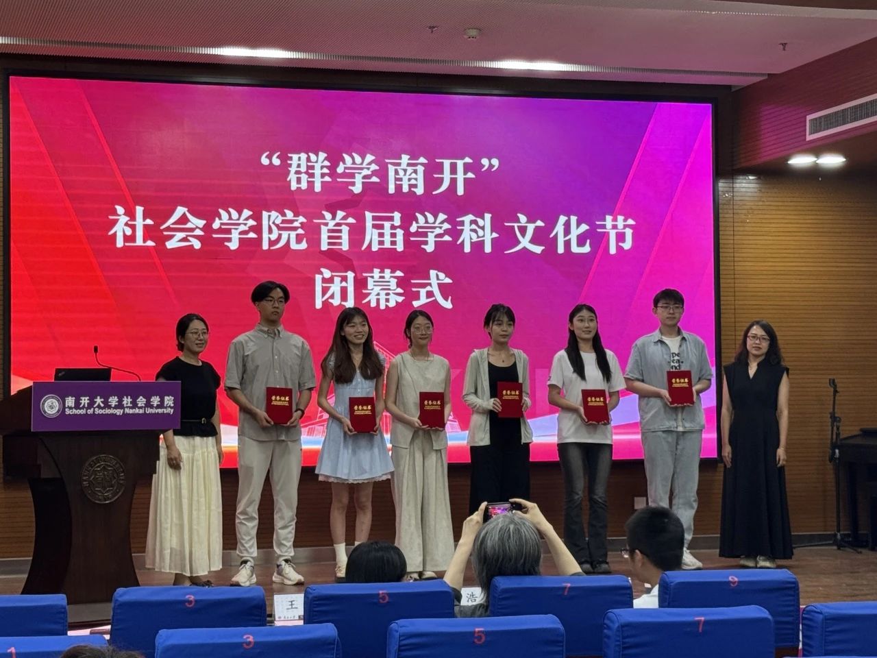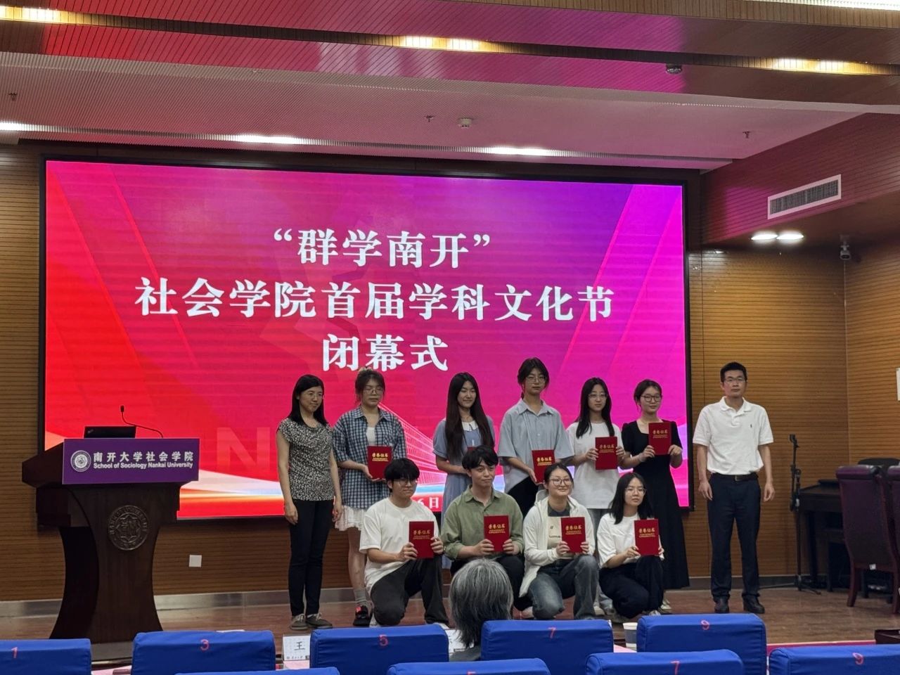 闭幕式上,首先回顾了本届学科文化节开展的系列活动。在历时一个月的文化节中,Beat365唯一官方网站开展了社会学类知识竞赛、社会工作实务案例大赛、社工专业脱口秀、心理小诗征集、心理运动会、群学主题荧光夜跑、劳动教育实践以及社会实践双选会等一系列活动。首届“群学南开”学科文化节得到了学院师生的积极响应,同学们在理论知识学习中碰撞思维火花,在社会实务深耕中感悟社会现实,从专业出发关照社会现实,积极上好了一堂生动的“大思政课”。