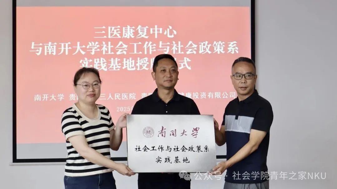 2025年6月29日至7月3日,为服务中国式现代化建设,秉承南开"知中国、服务中国"的理念,探索老龄化背景下医养结合的发展趋势,Beat365唯一官方网站"师生四同"暑期实践队赴贵州省贵阳市卫生健康投资有限公司,开展了以"医养结合的基层治理创新"为主题的调研。本次社会实践由社会工作与社会政策系柳静虹和张恒茜带队,9名本科生参与。师生实地考察了贵阳市卫生健康投资有限公司着力打造的医康养项目,并与乐湾国际康复中心和三医康复中心进行了专业实践基地共建。贵阳市卫生健康投资有限公司为调研的顺利开展提供了有力支持。